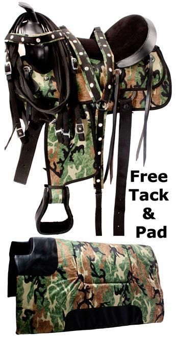 Color: Green Camouflage & Black Soft Well Padded Suede Seat Blevins Buckles Adjustable Padded Stirrups Soft Fleece Padded Underside For Horse Comfort Strong Double Reinforced Fiber Glass Tree Numerous Rings And Ties Lightweight Saddle Measurements: Seat: 14 - 18 Gullet: 6.5 QHB 7.25 high can accommodate higher withered horses Skirt: 24 - 28 Horn: 3 Swell: 14.5 Cantle: 4.5 Stirrups: 28-38 Weight: Approx. 15 lbs