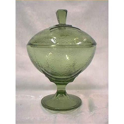 Candy Dish is green on a stemmed base with lid. The candy dish has a textured surface and measures 5.5 inches wide and 7.5 inches high. This candy dish is in fine condition with no chips or cracks.