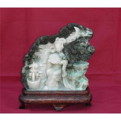 This Jade Stone display is about the ancient "Moon fastival" story. Because of the escape from the husband, a woman, who ate a special pill, flied to the moon and lived that for a long long time. Over there, there was a rabbit serving her.