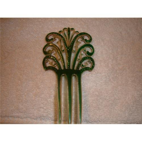 This is a Green 3 prong celluloid rhinestone comb. No rhinestones are missing. There are no chips, cracks, etc. It has alot of little delicate features to it.