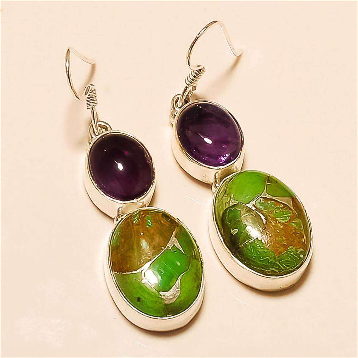 Green Copper Turquoise/Amethyst Earring Solid Sterling Silver Length:1.75 inch Weight:10 gram #E-042