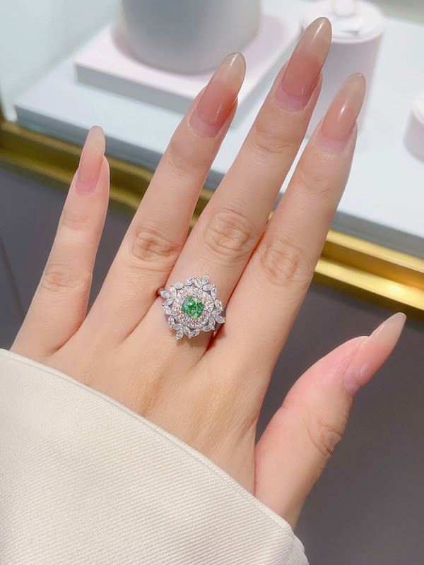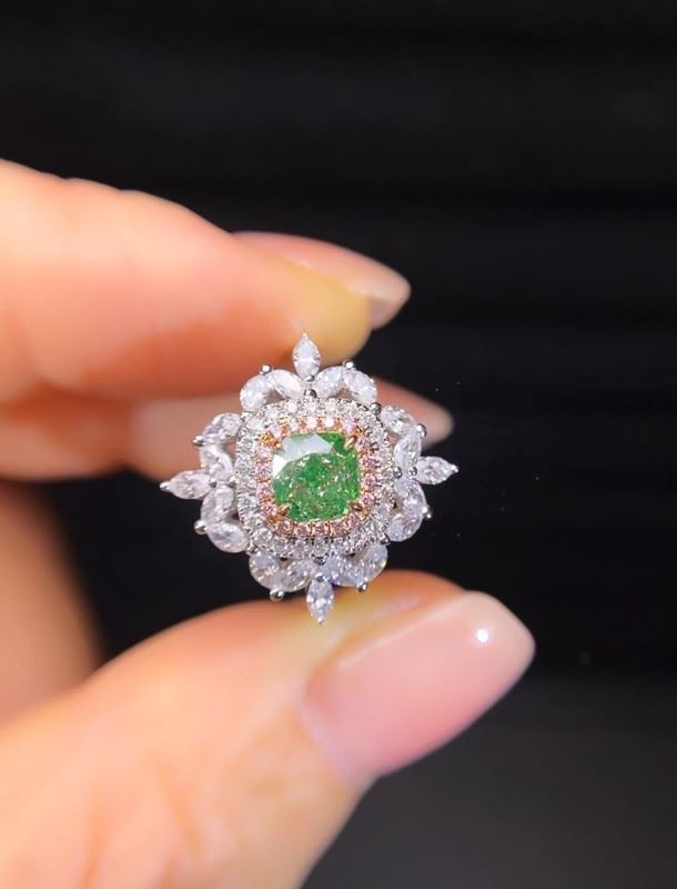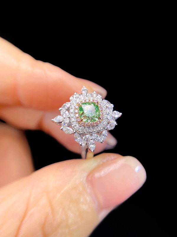 This green cushion diamond floral ring features a vivid green center stone with exceptional brilliance and precision cut. Surrounded by a halo of delicate pink and white diamonds, it creates a graceful gradient of color and light. The outer layer of pear-shaped diamonds forms a floral silhouette, adding elegance and depth to the design. Radiant and refined, this ring perfectly balances bold color with feminine sophistication — ideal for both special occasions and everyday luxury.Ring size: 6, circumference: 52 mm, diameter: 16.6 mm, main diamond: 0.72 ct, side diamonds: 0.816 ct.Note: Comes with a GIA Natural Diamond Report.
