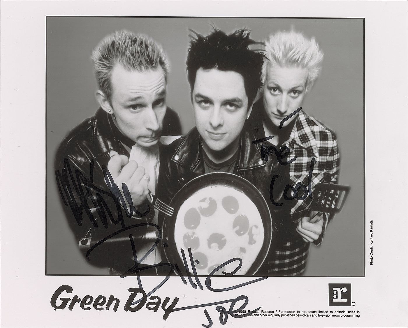 Satin-finish 10 x 8 Reprise Records publicity photo of Green Day from 1998, signed in black felt tip, "Mike," "Billie Joe," and "Tre Cool." In fine condition.