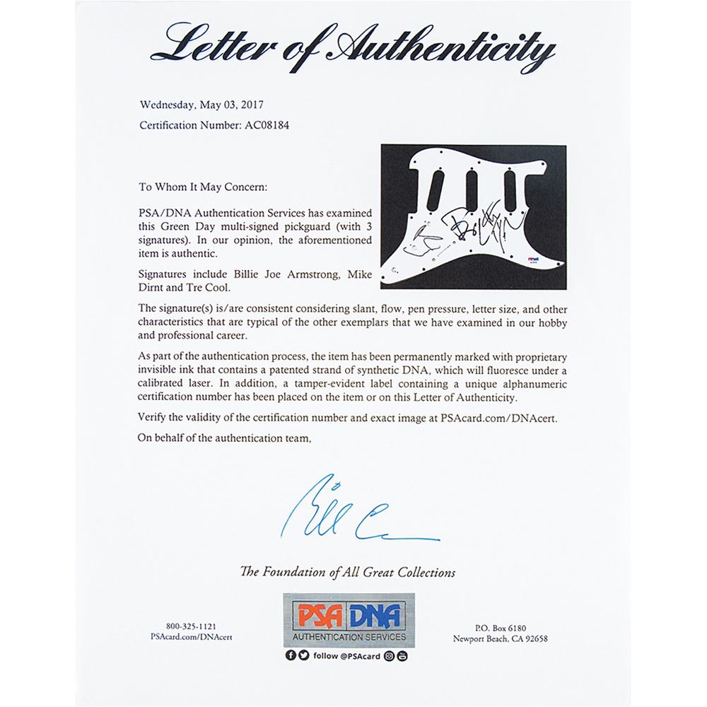 White Stratocaster-style electric guitar pickguard signed in black felt tip by Green Day—Billie Joe Armstrong, Tre Cool, and Mike Dirnt. In fine condition. Accompanied by a full letter of authenticity from PSA/DNA.