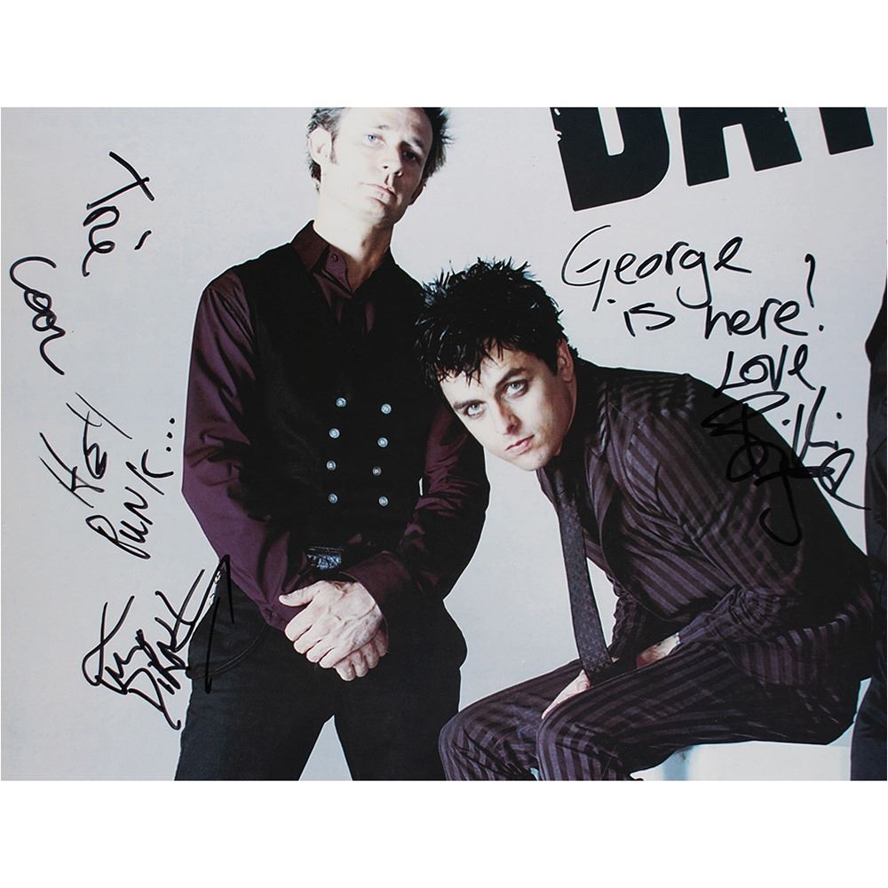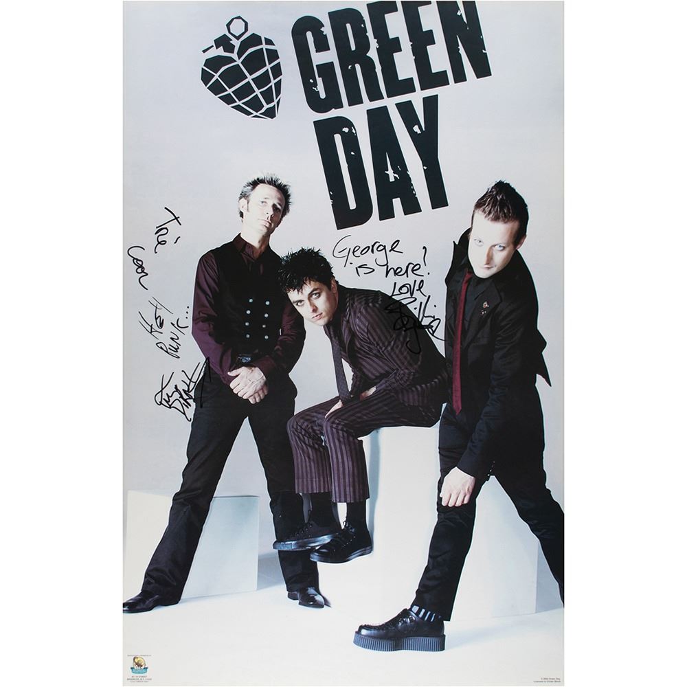 Color 22 x 34.5 poster of the dapperly dressed punk rockers Green Day from 2004, which dates to the release of their Grammy Award-winning album American Idiot, signed and inscribed in black felt tip, "George is here! Love, Billie Joe [Armstrong]," "Hey punk…Mike Dirnt," and "Tre Cool." Rolled and in fine condition.