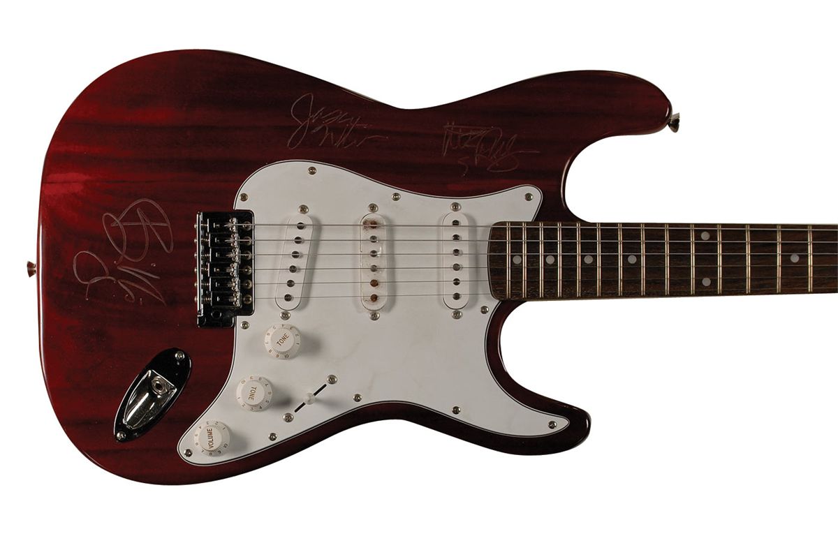 Cherry red-finish Galveston ‘stratocaster-style’ electric guitar, signed on the body in silver ink by Billie Joe Armstrong, Jason White, and one other. In fine condition, with a bit of irregular adhesion to signatures. Accompanied by a full letter of authenticity from PSA/DNA. Oversized.