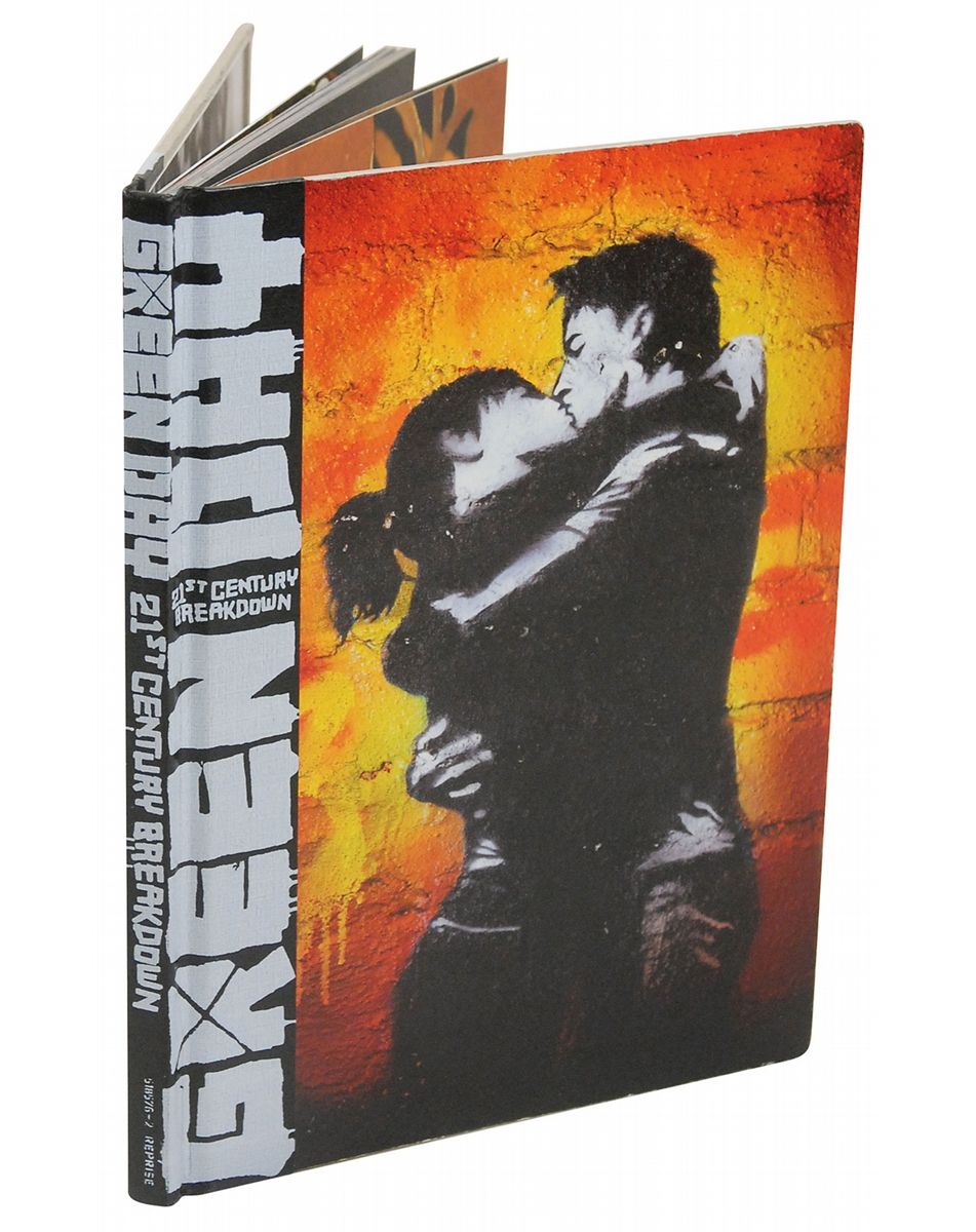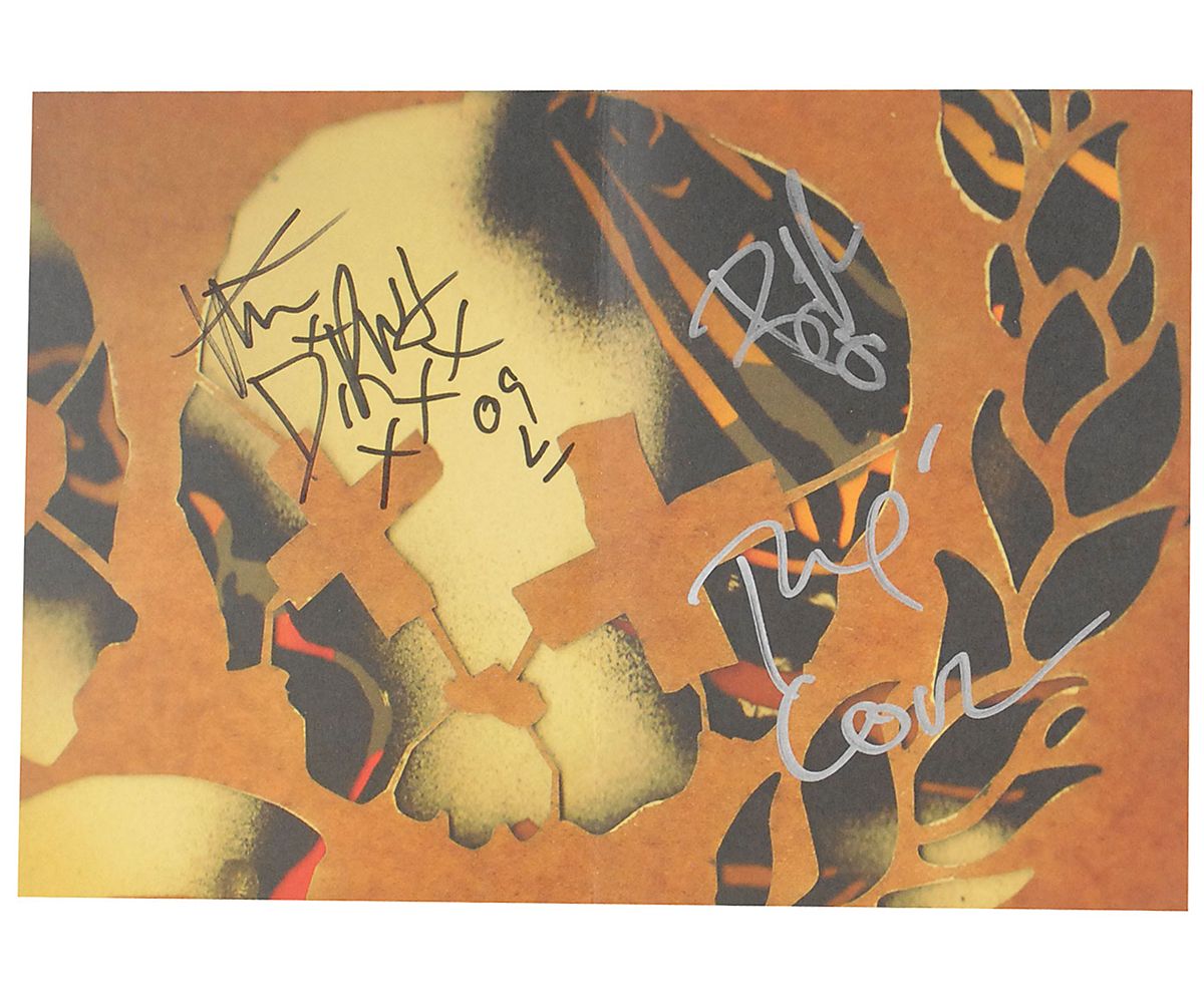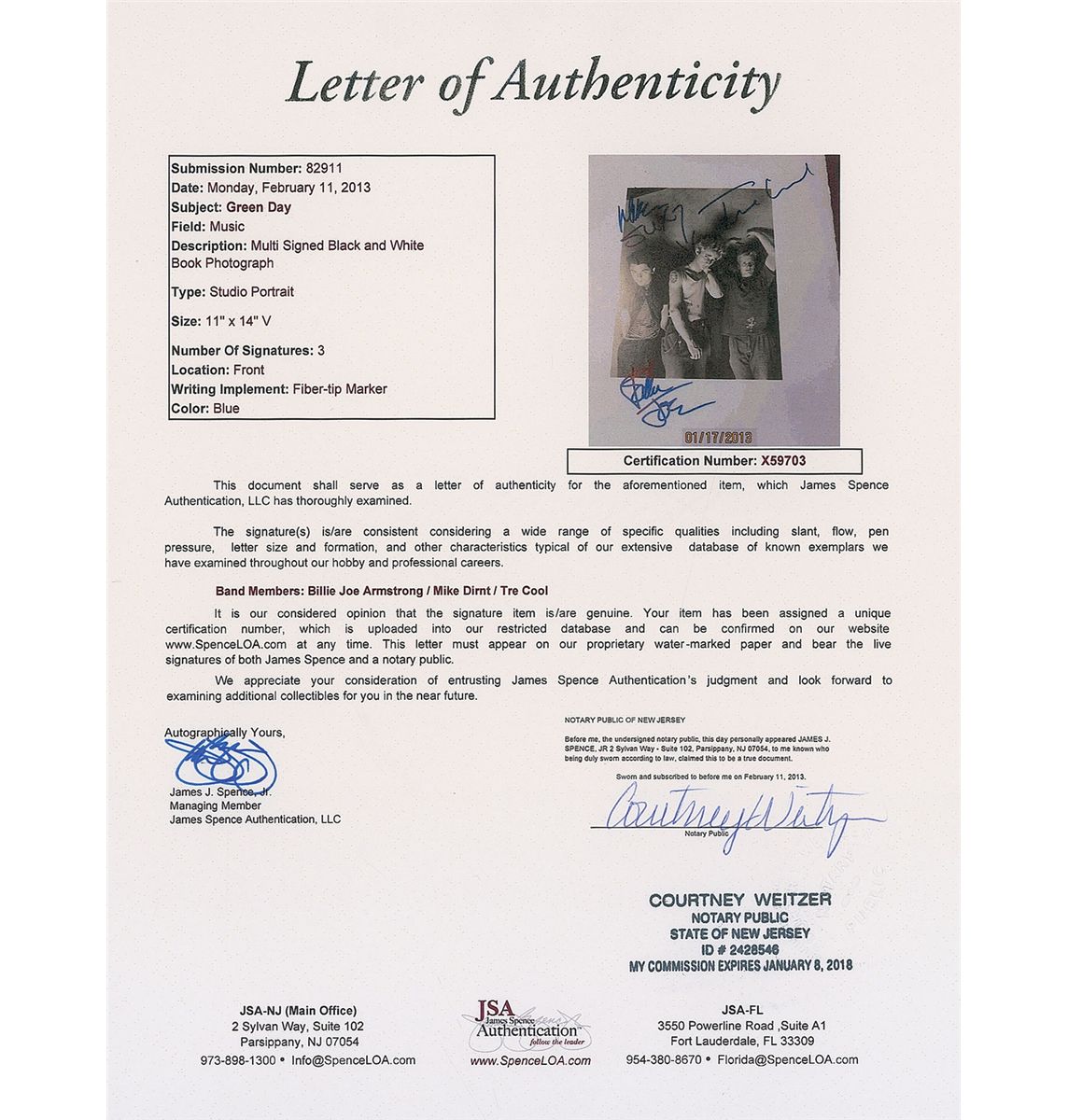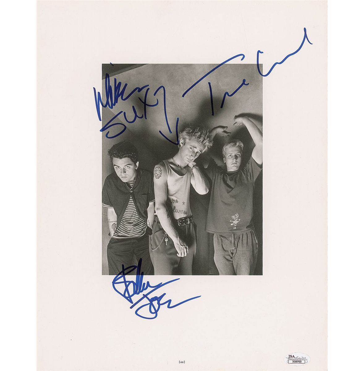 Two items: a 10.75 x 14 book photo of the group, signed in blue felt tip by Billie Joe Armstrong, Tre Cool, and Mike Dirnt, with one adding an arrow pointing to Dirnt and adding, “Sux,” above his image; and a 21st Century Breakdown CD, signed in felt tip and ink on the front pastedown and first free end page of the CD’s book by all three members. The CD is included. In fine condition, with a James Spence authentication label affixed to lower corner of photo. Accompanied by a full letter of authenticity from James Spence for the photo, and a flyer from the Best Buy event at which the CD was signed.