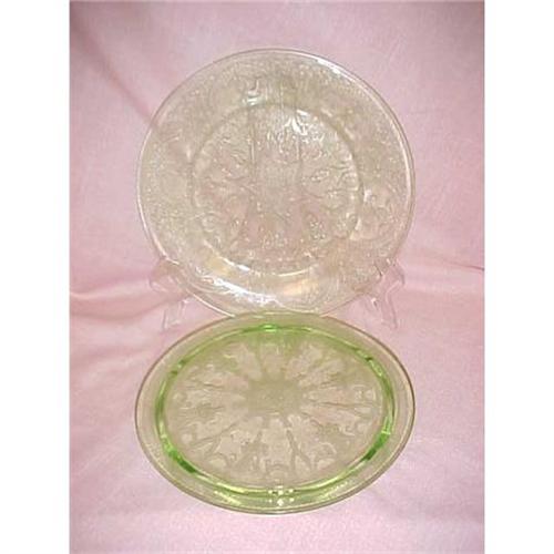 Green Depression Cake Platter and Sandwich Plate-Cake Platter is Cameo Hocking and features three legs (10x 1.25"). Sandwich Plate is in the horsehoe pattern from Indiana Glass Company from 1930-1933 (11.5") and has a small chip on one side. Great Collector's Pieces! All measurements are approximate.