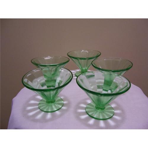 I have a set of 5 vintage green depression glass sherbets.They are made by Federal Glass and have the stamp on the bottom. They mix easily with several depression glass patterns and are a lovely addition to any collection or to make your holiday table look lovely. There are no chips or scratches. If you have any questions please e-mail. I will quote exact shipping on request. Thank you for looking.
