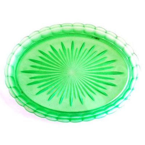 This beautiful Art Deco florescent glowing green satin Depression glass oval vanity tray, measures 11 1/2"x 8 1/2". Has a scalloped rim and a sunburst design emanating from its center., Originally part of an old Depression glass vanity set it is still in excellent condition.