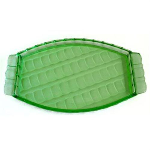 <table width="100%" border="0" cellspacing="0" cellpadding="4"><tr><td><em> </em></td></tr><tr> <td width="100%"> This exquisite Art Deco glowing green Depression glass vanity tray, meauring 13 1/2"x 8" x 1", including handles, has a symmetrical, prismatic, cut & faceted, design and is from an old Depression glass vanity set. This lovely dresser tray fluoresces under black light and is in excellent condition. Matching small powder jars, the large vanity jar and candlesticks, from this dresser set, are for sale in separate auctions. </td></tr><tr> <td> </td></tr><tr> <td>Reference #: aaGDADGVT</td></tr><tr><td>Condition:Excellent</td></tr><tr><td>Year:1930s</td></tr><tr><td>Title:Green Depression Glass Art Deco Vanity Tray</td></tr><tr><td>Location:Orlando, Florida</td></tr></table>
