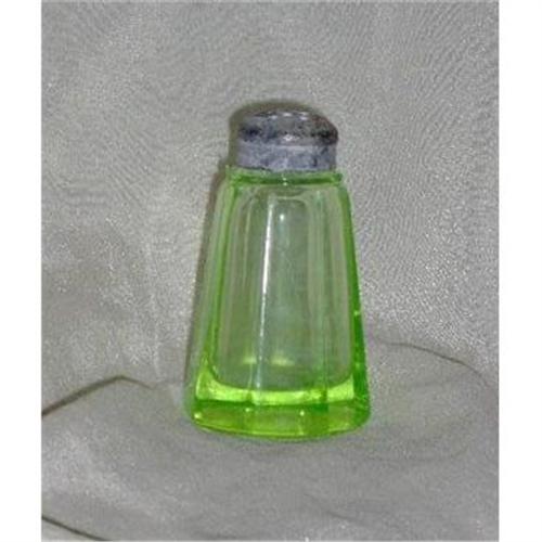 Although not a pair, this green depression octagonal glass salt shaker must have a mate out there somewhere! It resembles the block optic pattern; however, due to the rarity of this sort of item, I cannot absolutely determine the pattern. It is unmarked. The green glass tends to be more of a vaseline color. It is 3 inches tall with a 1 3/4-inch bottom and is quite weighty. The metal top shows a bit of age; however, the shaker itself is in excellent condition! <p>Shipping is determined after checkout. <p>