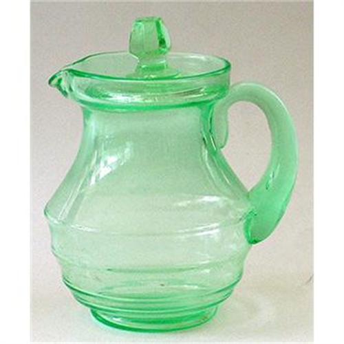 <tr><td><font size="2" face="Arial, Helvetica, sans-serif"><strong><font color="#000033">Title:</font></strong>Green Depression Glass Covered Syrup Pitcher</font></td></tr>