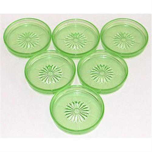 This set of six gorgeous Hazel Atlas green Depression Glass DAISY coasters have a diameter of 3 1/4". They are shown on pg 118 in Hazel Weatherman - Colored Glass of the Depression Era Vol 2. They glow under blacklight, and are all in excellent condition.