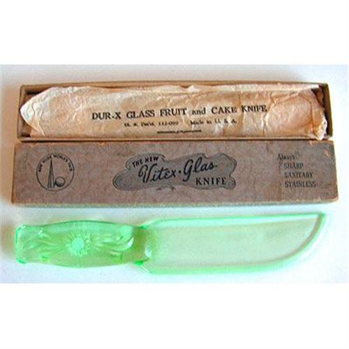in its original box and tissue paper is in near mint slightly used condition. The knife measures 8 1/2" long and is marked on one side of the blade MADE IN U.S.A. and DUR-X on the other - THE NEW Vitex ? Glas KNIFE box,, also in excellent condition, has the symbol of the NY Worlds Fair - and the original tissue paper is marked DUR-X GLASS FRUIT and CAKE KNIFE