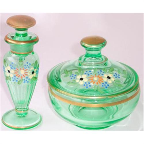 <tr><td>Title:Green Depression Glass Decorated Vanity Set</td></tr>