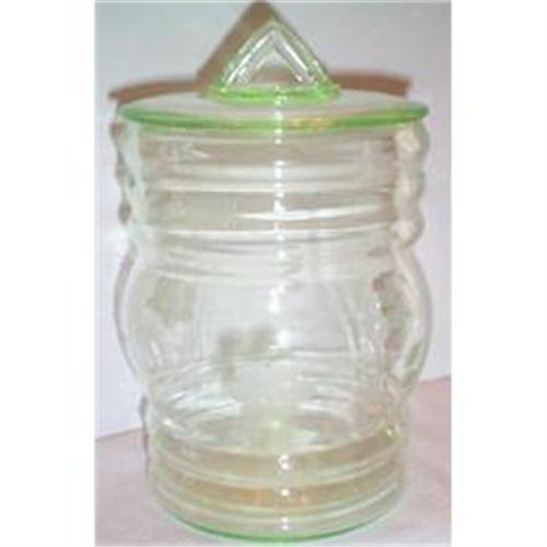 <tr><td>Title:Green Depression Glass Etched Cracker Jar</td></tr>