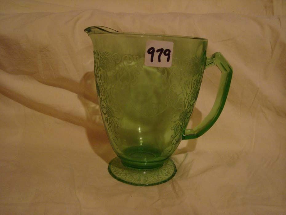 Green Depression Glass, Florentine Poppy Pattern Water Pitcher and Green Dpression Glass Bowl