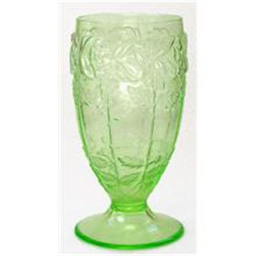 This set of four lovely glowing green Depression Glass footed tumblers feature an embossed pattern of large roses that surround the rim and leaves surround the bottom. Produced during the late 1920s or early 1930s. They each measure about 5 1/2 inches tall x 2 3/4 inches across the rim x just under 3 inches across the base and are all in excellent condition. Although the photo is of one tumbler the auction is for a set of four.