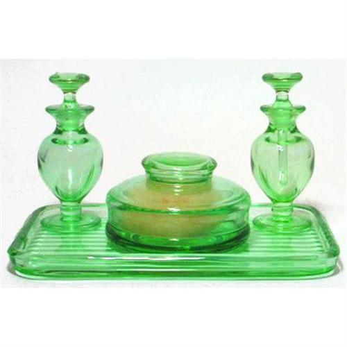 From New Martinsville Glass, known as 'No. 1926', this seven piece vanity set consists of two perfume bottles, a powder jar and a tray. Lovely gently rounded Art Deco bottles and jar. The perfume bottles measure 4 3/4" tall - one stopper is ground and has a 2" dauber, the other stopper is ground. The powder jar is 4 1/4" in diameter and has two compartments - the larger bottom area holds, we believe, the original puff, the smaller second compartment sits on top of the first is 1 1/2" in diameter, was designed to hold rouge or cold cream, and has a small lid. The New Martinsville tray measures about 9" x 6 1/2" with rounded corners and a ribbed design. Shown on page 120 of Whitmyer - Bedroom & Bathroom Glassware of the Depression Years. The seven pieces fluoresce under black light and with the exception of a small chip on the rim of the small compartment lid they are all in excellent condition.