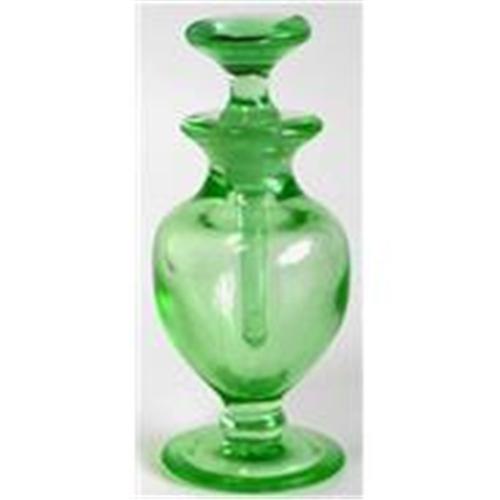 From New Martinsville Glass, known as 'No. 1926', this lovely perfume bottle, has a gently rounded Art Deco shape. Measure 4 3/4" tall with its faceted and jewel like stopper. Shown on page 120 of Whitmyer - Bedroom & Bathroom Glassware of the Depression Years. This superb green Elegant Depression Glass perfume bottle and stopper, complete with its 2" dauber, is in excellent condition and fluoresce under black light.