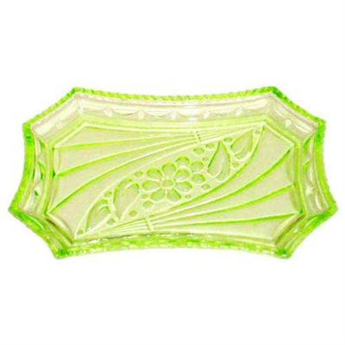 From the famed Sowerby Glassworks of Gateshead, Northern England this lovely Art Deco pressed Elegant Depression glass vanity tray has an intricately geometric floral design. This curved, eight sided, scalloped edged tray measures 12" x 8", was produced in a pale unanium green and is in excellent condition.