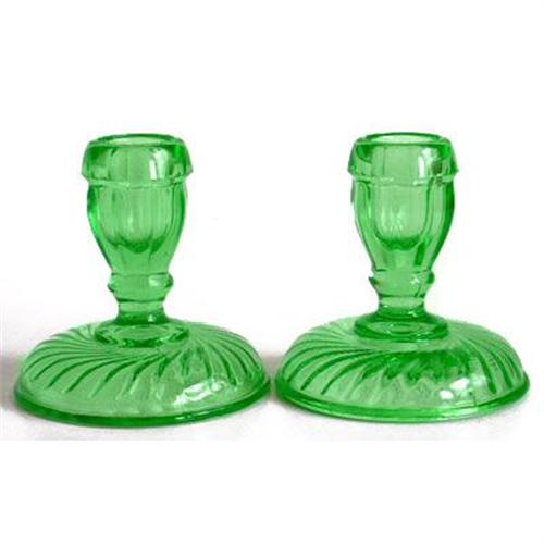 Pair of fluorescent green Depression glass candlesticks with a swirl or twist pattern. The deep candleholders are eight sided and have an optic design. They each measure 3 1/2 inches tall x 3 1/4 inches across the base and are both in excellent condition.