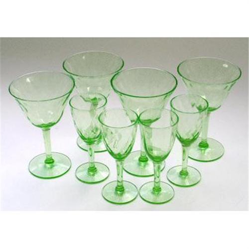 This set of eight lovely glowing green Depression Glass footed wine stems (4) and cordials (4) feature a diamond optic pattern. Produced during the late 1920s or early 1930s. They wine stems each measure about 4 1/4 inches tall x 2 3/4 inches across the rim - the cordials each measure 3 3/4 inches tall x 1 1/2 inches across the rim and are all in excellent condition.