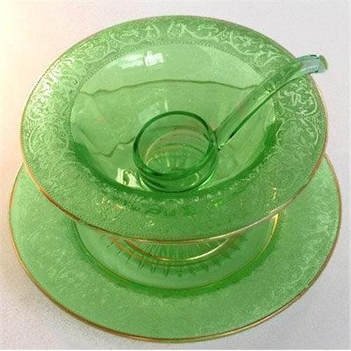 This gorgeous 3 piece green Elegant Depression Glass Mayonnaise set, believed to have been produced by Tiffin Glass, then decorated and etched by The Lotus Glass Co. Intricately etched, trimmed in gold and round in shape The bowl measures about 3 1/2" high and 7" across the top, the plate about 7 1/2" across, and the ladle is about 5" long. With only minimal wear to the gold all three pieces of this florescent green Elegant Depression glass 3 piece mayonnaise set are in excellent condition