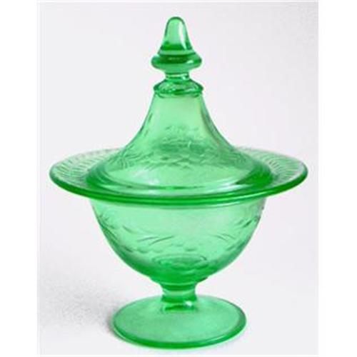 <tr><td>Title:Green Elegant Depression Glass Etched Candy jar</td></tr>