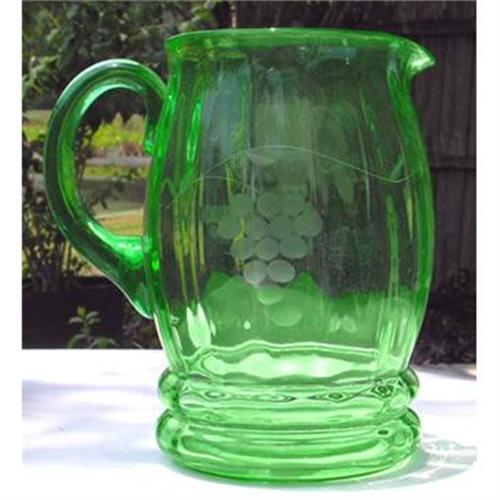 This lovely green Elegant Depression glass pitcher was produced during the 1930s and features an etched grape surround and an Art Deco shape. Fluoresces brilliantly in black light, holds more that 2 quarts, measures 8 1/4" tall x 5 1/4" in diameter and is in excellent condition.