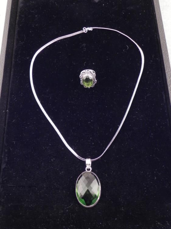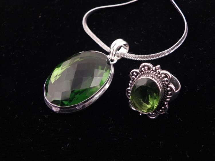 Ring & Pendant Necklace SetGemstones: Green Emerald Cut: Oval, facetedPendant: 34 mm stone, in beaded sterling setting, on 16" chainRing: 16 mm stone, in sterling beaded, and rope pattern flower settingCondition: Excellent
