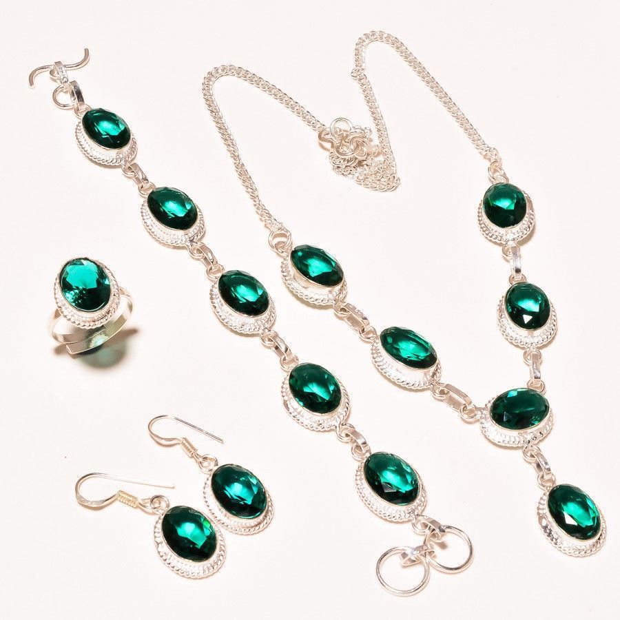 Breathtaking green emerald 4 piece jewelry set. These lab made gemstones are near flawless. They burst out with a dazzling sparkle and vivid even tone. The 4 piece set includes an 18 inch 6 single stone faceted necklace, bracelet, earrings and finger ring size 7. The ring is adjustable so fits almost everybody. Mounted in .925 sterling silver overlay. Total approximate weight of all pieces is 55.1 grams.