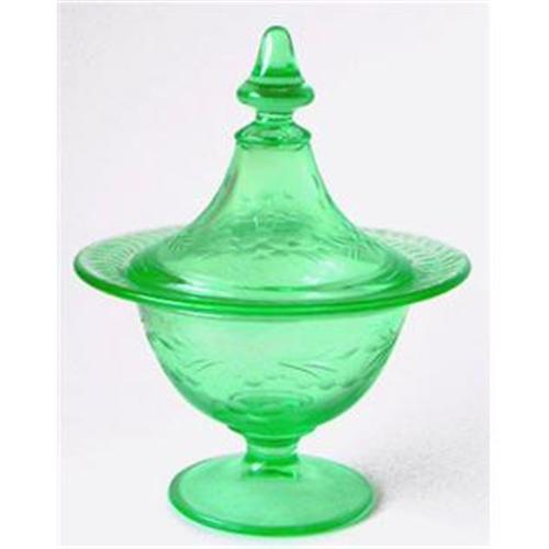 <tr><td>Title:Green Etched Depression Glass Candy jar</td></tr>