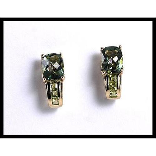 Wonderful earrings with 2 cushion shaped green fluorites (9 x 7) and 6 square cut green peridots set in 14K yellow gold. The earrings measure 18 millimeters (11/16 inches) long x 7 millimeters (9/32 inches) wide and weigh 5.10 grams
