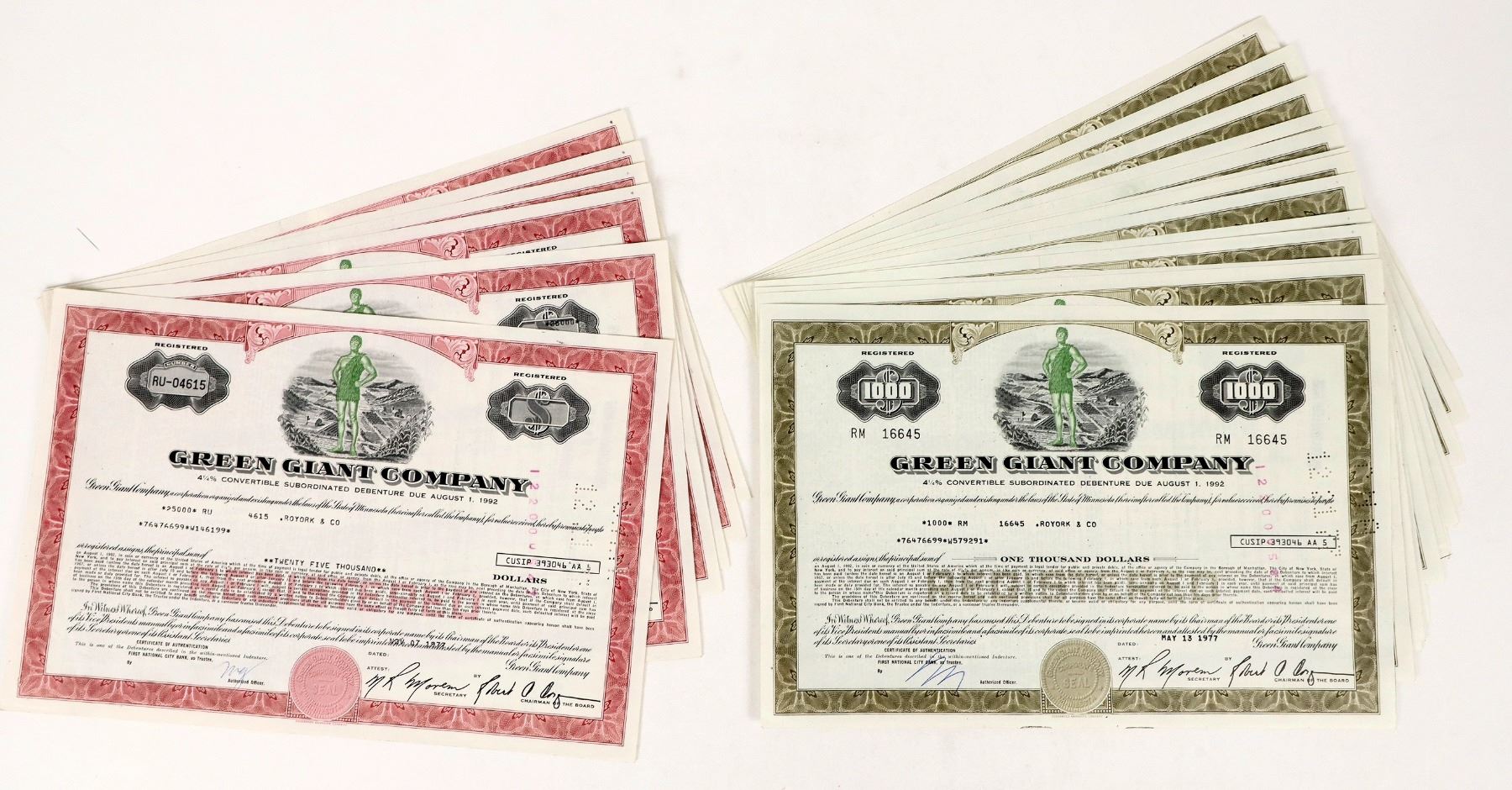 There are twenty stock certificates for the Green Giant Company. Fourteen certs. in green are for 1000 dollars each, and the red certs. are for $25,000 each. Please see photo for details.