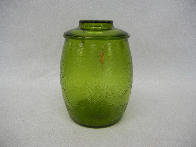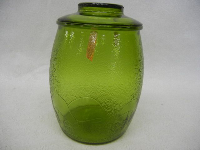 Green Glass Cookie Jar w/ Mushroom Pattern