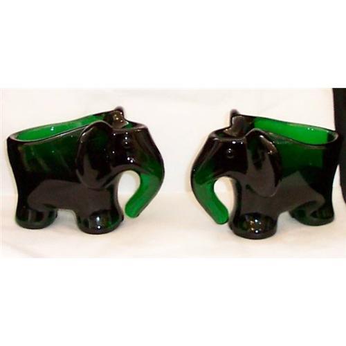 Antique green glass elephants that are open with a spoon rest. This is one of two available.