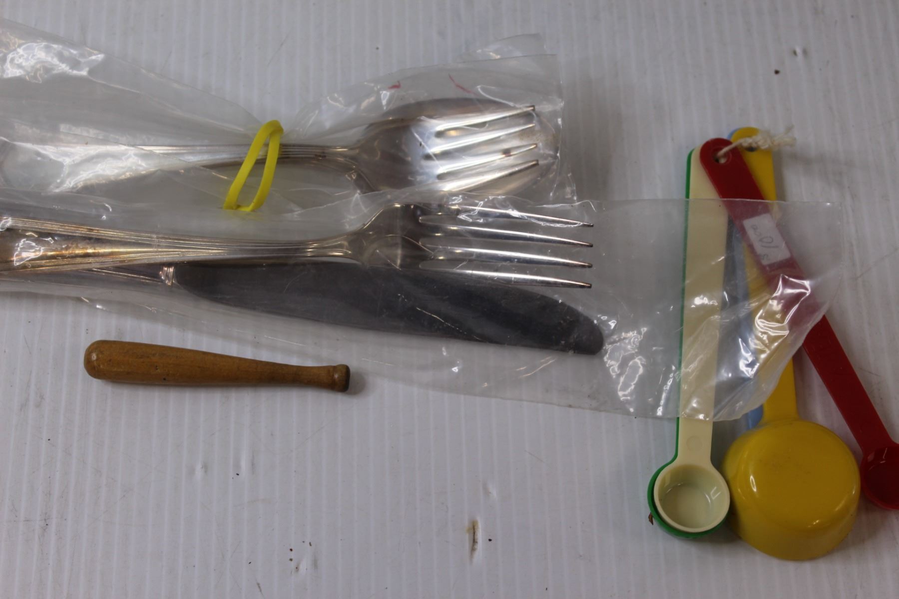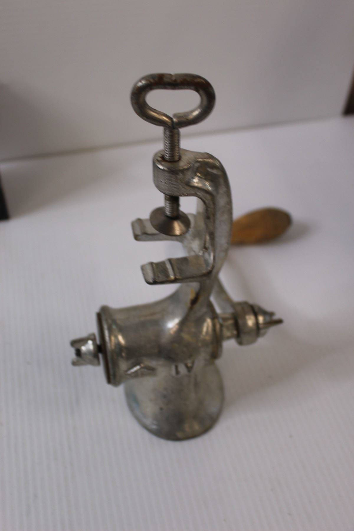 Green Glass Insulator, Federal Coin Bank Bronze Plated Train Car, Polaroid Camera - as is, Meat Grinder, Measuring Spoon Set, Misc.