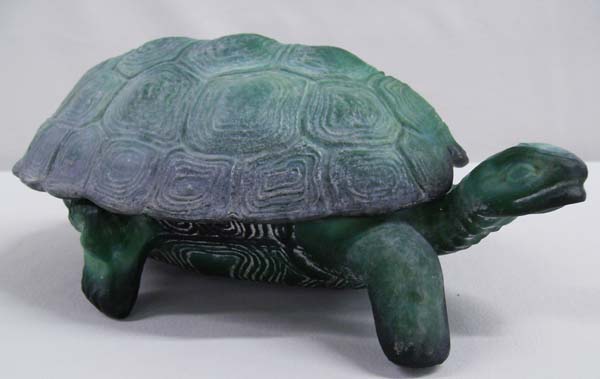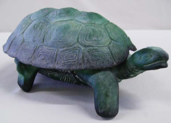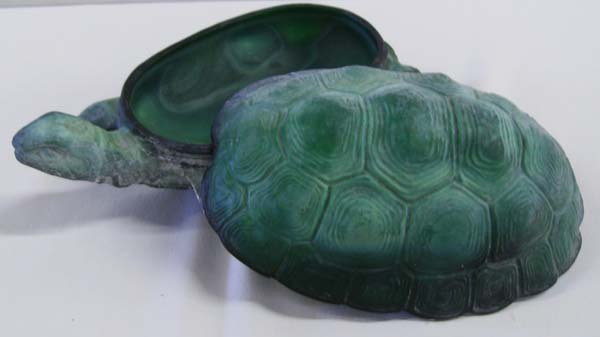 Green glass turtle container with lid. 3.5' H x 4.5'' W. 8'' long. Buyers pay actual shipping and handling charges, (see terms and conditions for more information).