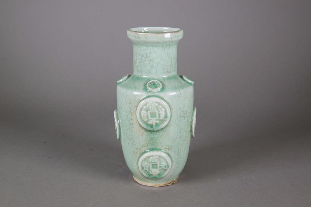 Chinese crackle glazed Guan type vase; featuring coin patterns on body; of celadon green tone; Qing Xianfeng period; H: 20 cm, D: 11 cm, 710 grams