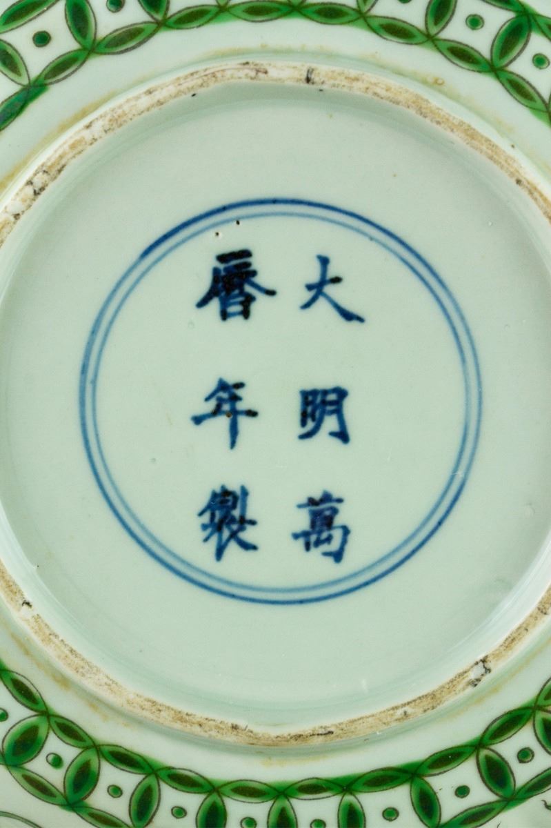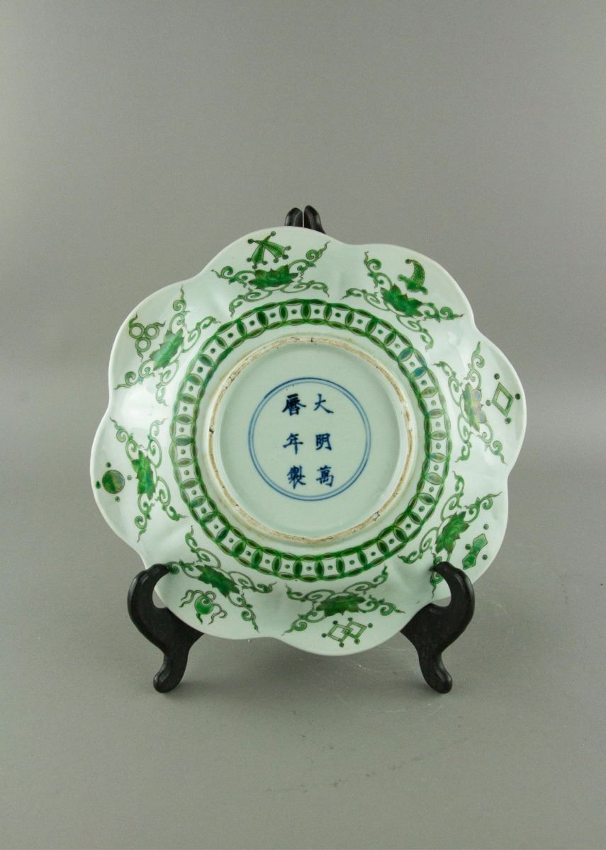 Chinese green glazed porcelain plate; of shallow rounded sides with eight-lobed galleried rim; the interior painted with panels of coiling five-clawed dragon amidst clouds; six-character Wanli mark on base; H: 7 cm, D: 26.5 cm, 721 grams