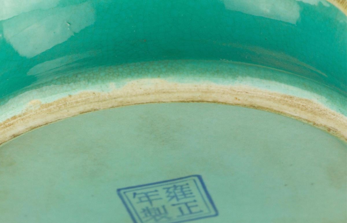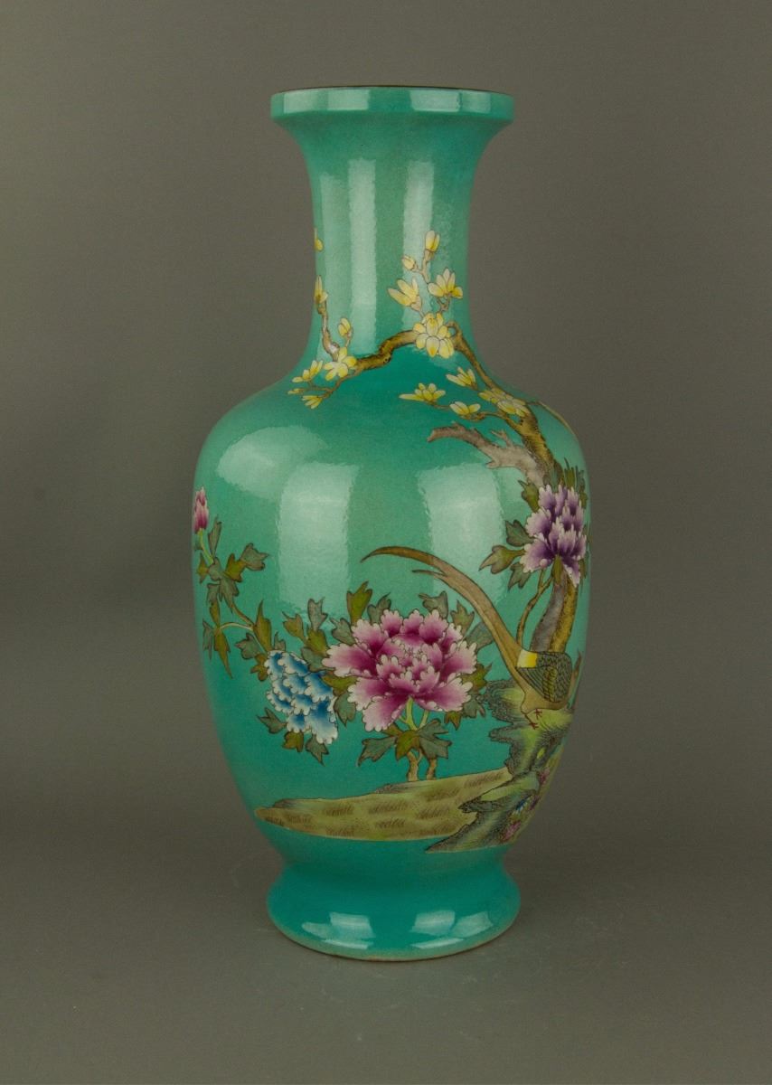 Chinese Famille Rose porcelain vase; of ovoid body with slender neck and splayed foot; painted with birds and flowers on green ground; four-character Yongzheng mark on base; H: 44 cm, D: 20 cm, 2759 grams