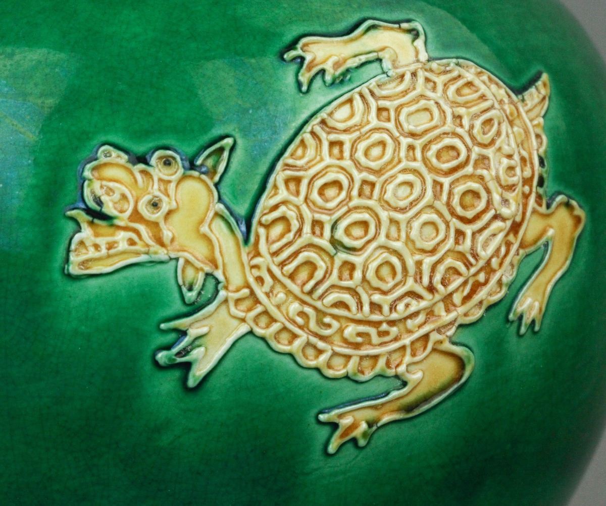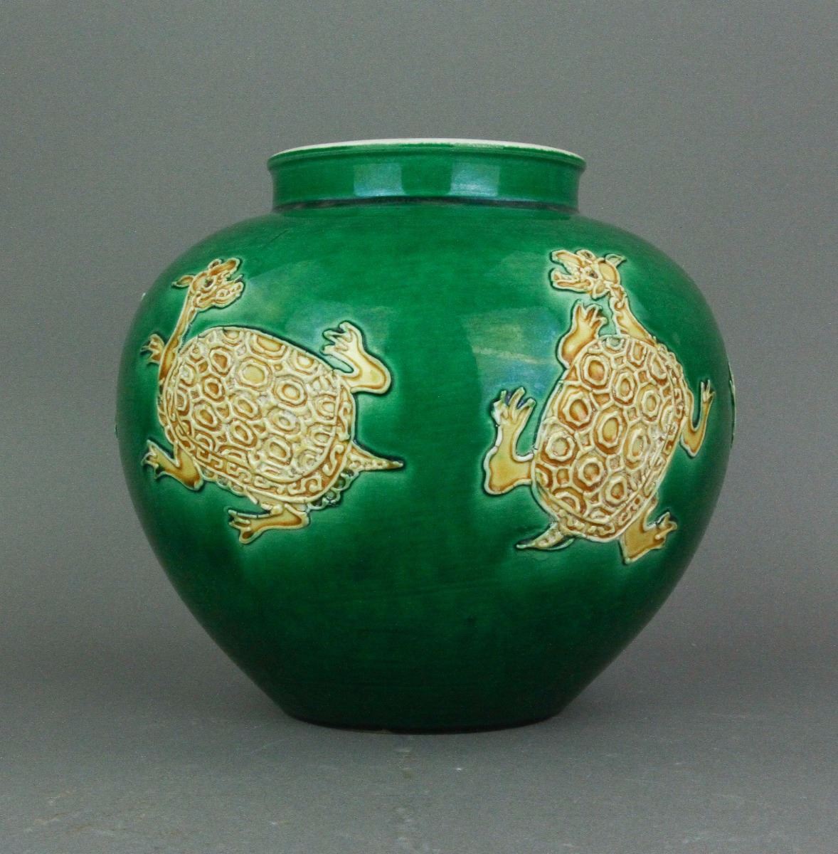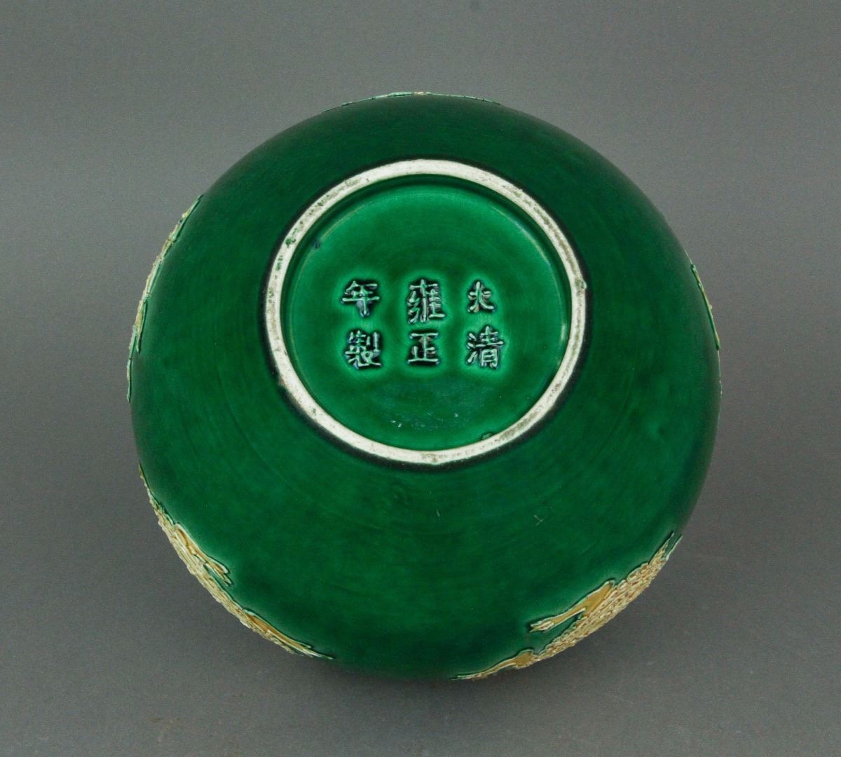 Chinese small green ground porcelain jar; of globular body with straight mouthrim; featuring incised turtles with dragon heads; six-character Yongzheng mark on base; H: 16 cm, D: 17 cm, 985 grams