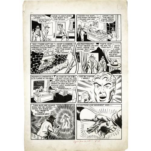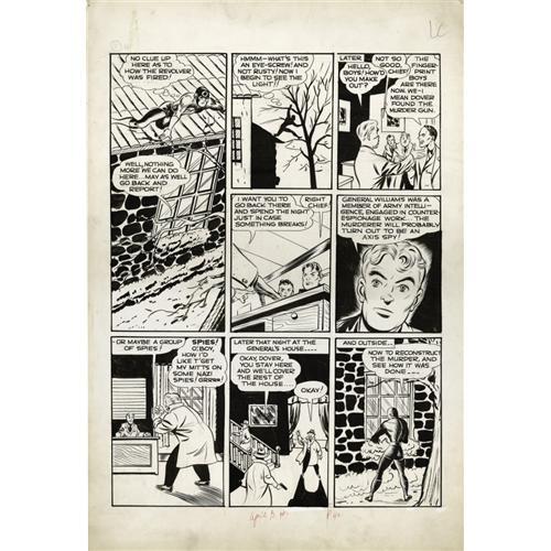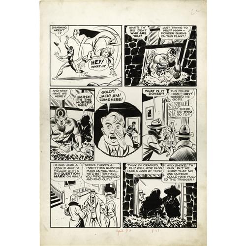 <B>Harry Sahle (attributed) - Green Hornet #12 Complete 8-page Mister Q Story "Long Distance Murder" Original Art (Harvey, 1943).</B></I> Before Steve Ditko created the Question, there was another, older enigmatic hero -- Mister Q! And like the Question, Mister Q appears out of a cloud a smoke to baffle and apprehend his foes. In this thriller, Mister Q springs into action to solve the strange death of General Williams and smash a Nazi spy ring. The image area of each page, except page one, measures 13" x 18". The title logo from page one was cut off; otherwise, the art averages Very Good condition.