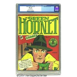Green Hornet Comics #2 (Harvey, 1941) CGC FN+ 6.5 Cream to off-white pages. Bert Whitman's cover was an attention-getter in 1941, when the early issues of the title were based on radio adventures. Just two copies of issue #2 have earned higher grades from CGC to date. CGC notes, "10 inch tear 22nd page." Overstreet 2003 FN 6.0 value = $573. Important notice: Heritage usually auctions material at the rate of 200-250 lots per hour. On some occasions eBay Live bid software or the Internet may not be able to keep up with the pace of the auction. We recommend placing a realistic absentee bid now as insurance to avoid disappointment. Occasionally the auctioneer may eliminate or reject an eBay Live bid, and the auctioneer may also reopen a lot after the close of the eBay live bidding (usually because we missed an audience bid), and may reject your bid even if it shows you as the winning bidder. By bidding via eBay Live, you agree that Heritage may award the lot to another bidder at its sole discretion under the circumstances described above or any other reasonable circumstances. Since eBay bids are not shown to us until we open the lot on the floor, we treat those bids just like floor bids. In most cases the floor responds before the eBay bid is presented to us, due to Internet lag time, so for consistency we have made it a policy that floor bids are always considered first over tie eBay live bids. Also please note that all Heritage lots purchased through eBay Live carry a 20% Buyer's Premium. Please make sure you read the Terms and Conditions before you bid.