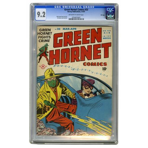 <B>Green Hornet Comics #33 File Copy (Harvey, 1947) CGC NM- 9.2 Off-white to white pages.</B></I> The Green Hornet (drawn by Al Avison) is joined by the Man in Black Called Fate (drawn by Bob Powell) in this issue. This is the nicest copy we've seen of this white-cover book. Overstreet 2006 NM- 9.2 value = $500. CGC census 3/06: 1 in 9.2, none higher.
