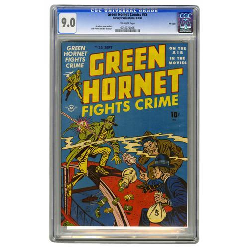 <B>Green Hornet Comics #35 File Copy (Harvey, 1947) CGC VF/NM 9.0 Off-white pages.</B></I> That stylistic chameleon Al Avison shows a bit of a Simon and Kirby influence on this issue's cover. No copy has been graded higher by CGC to date. Overstreet 2006 VF/NM 9.0 value = $370; NM- 9.2 value = $500. CGC census 3/06: 1 in 9.0, none higher.