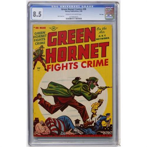 <B>Green Hornet Comics #38 File Copy (Harvey, 1948) CGC VF+ 8.5 Cream to off-white pages.</B></I> Shock Gibson by Bob Powell. A beautiful file copy. Only two other copies of this issue have earned a higher grade from CGC to date. Overstreet 2007 VF 8.0 value = $235; VF/NM 9.0 value = $368. CGC census 8/07: 1 in 8.5, 2 higher.<BR><BR><b>Shipping:</b> Comics - Slabbed (certified) (<a target="_blank" href="http://www.heritageauctions.com/common/shipping.php">view shipping information</a>)