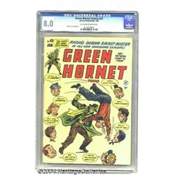 Green Hornet Comics #43 (Harvey, 1949) CGC VF 8.0 Off-white to white pages. Al Avison cover and art. Kerry Drake appearance. Overstreet 2003 VF 8.0 value = $198. Important notice: Heritage usually auctions material at the rate of 200-250 lots per hour. On some occasions eBay Live bid software or the Internet may not be able to keep up with the pace of the auction. We recommend placing a realistic absentee bid now as insurance to avoid disappointment. Occasionally the auctioneer may eliminate or reject an eBay Live bid, and the auctioneer may also reopen a lot after the close of the eBay live bidding (usually because we missed an audience bid), and may reject your bid even if it shows you as the winning bidder. By bidding via eBay Live, you agree that Heritage may award the lot to another bidder at its sole discretion under the circumstances described above or any other reasonable circumstances. Since eBay bids are not shown to us until we open the lot on the floor, we treat those bids just like floor bids. In most cases the floor responds before the eBay bid is presented to us, due to Internet lag time, so for consistency we have made it a policy that floor bids are always considered first over tie eBay live bids. Also please note that all Heritage lots purchased through eBay Live carry a 20% Buyer's Premium. Please make sure you read the Terms and Conditions before you bid.